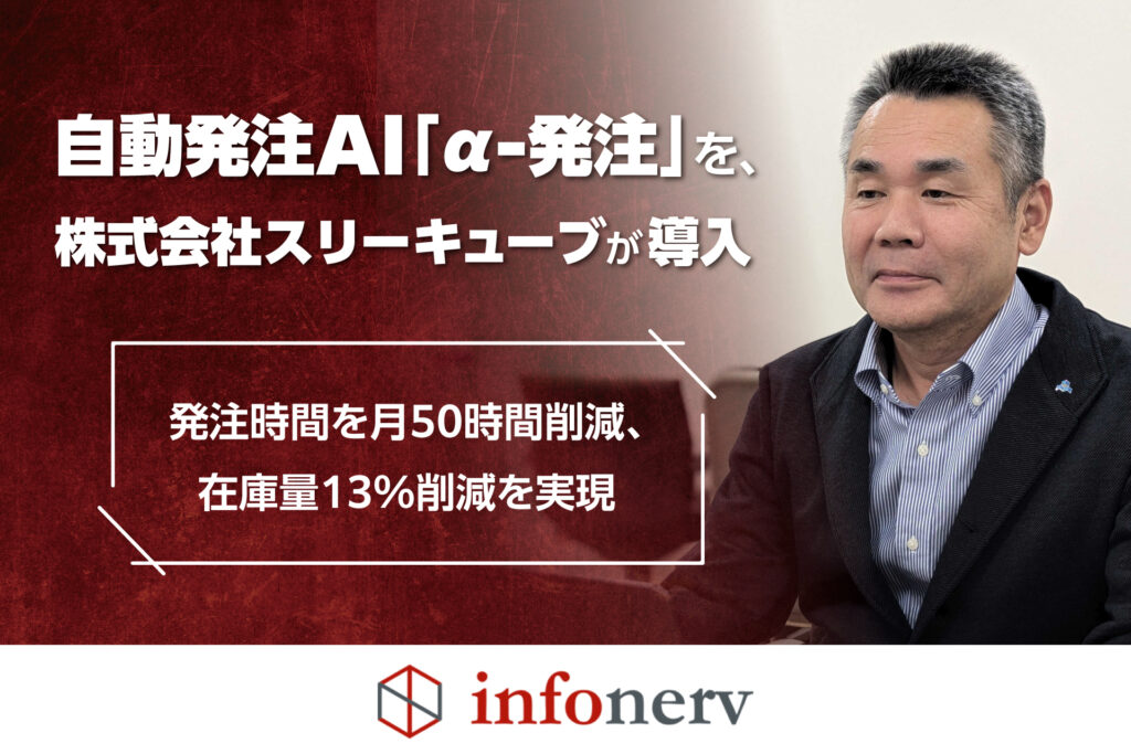 自動発注AI「α-発注」の開発・提供を行う株式会社infonerv(本社:東京都千代田区、代表取締役:江田 研人)は、生活雑貨およびインテリア雑貨の卸事業を運営する株式会社スリーキューブ(本社:高知県高知市、代表取締役社長:後藤 幸祐)に「α-発注」をご導入いただき、発注業務の大幅な効率化を実現したことをお知らせします。