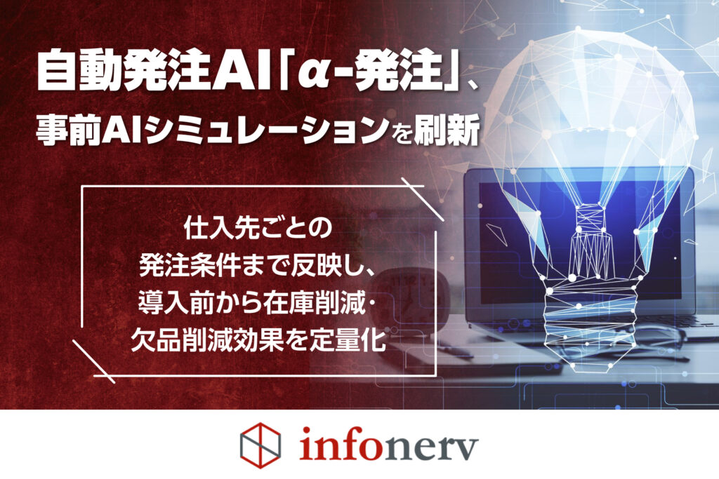 自動発注AI「α(アルファ)-発注」を提供する株式会社infonerv(東京都千代田区、代表取締役:江田研人、以下 当社)は、導入検討中の企業様に提供している事前AIシミュレーション機能をリニューアルし、仕入先ごとに定められている発注条件を反映した高精度な導入効果シミュレーションの提供を開始しました。